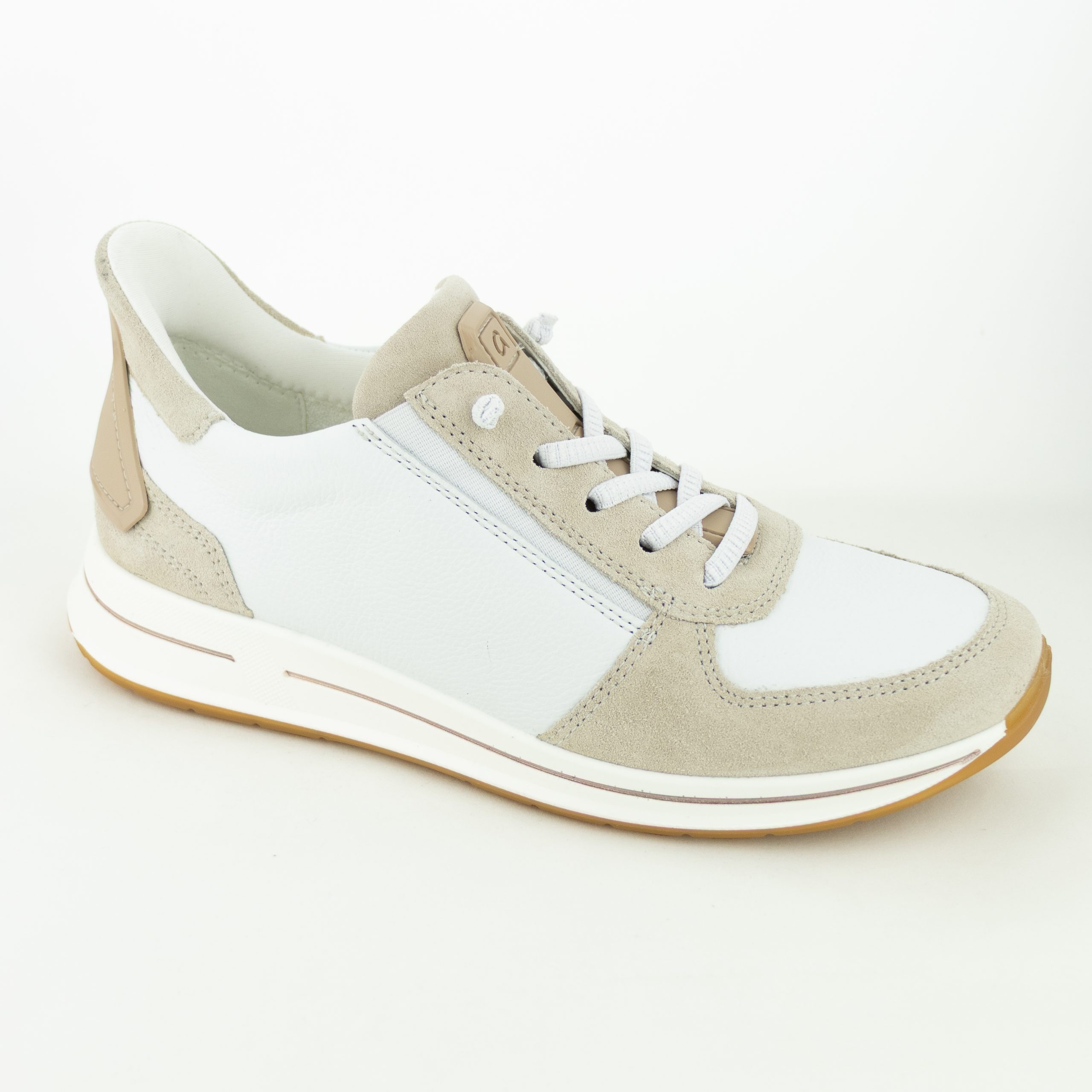 Maak kennis met de revolutionaire Ara Osaka, een SLIP-ON sneaker oftewel instap-sneaker die stijl en comfort combineert. De sneaker is uitgevoerd in beige suède/wit leder combinatie en heeft elastische inzetten aan beide zijkanten voor een gemakkelijke instap en een elastische koordsluiting. Hierdoor is veteren verleden tijd en stap je zelfs rechtopstaand zonder bukken in en uit de schoenen! Je voet “slipt” als het ware in de sneaker. De voering is van 100% natuurlijk materiaal, bamboo. Dit is huidvriendelijk, ademend en zorgt voor een aangenaam voetklimaat. Uitneembaar voetbed/geschikt voor eigen zooltjes. Wijdtemaat H.