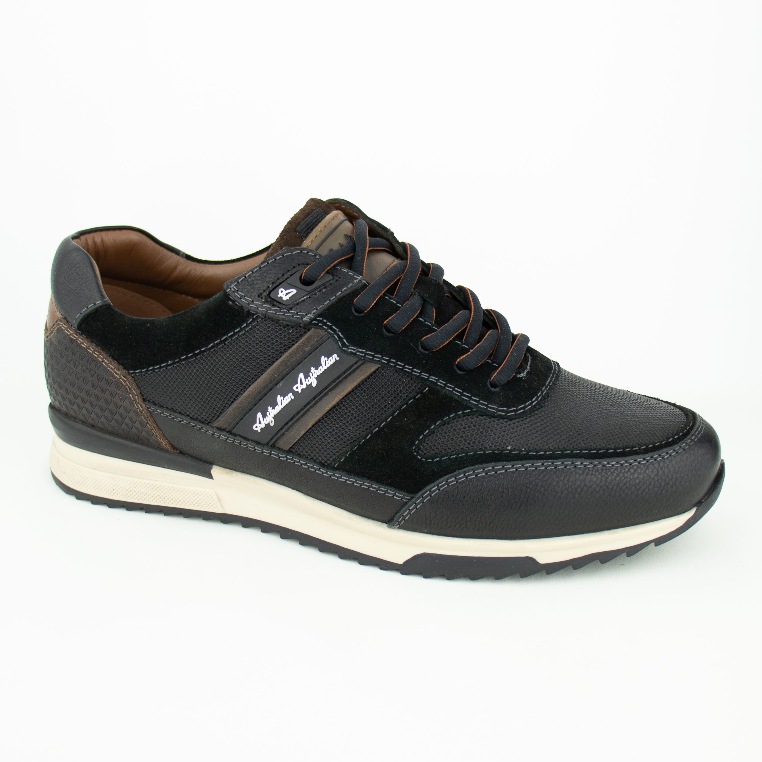 Deze sneaker weerspiegelt de basisprincipes waar Australian Footwear bekend om staat, namelijk kwaliteit en comfort. Filmon is uitgevoerd in zwart leder met bruine accenten. Het logo is duidelijk zichtbaar aan de zijkant en op de hiel. Uitneembaar leder voetbed, geschikt voor eigen zooltjes. Vetersluiting.