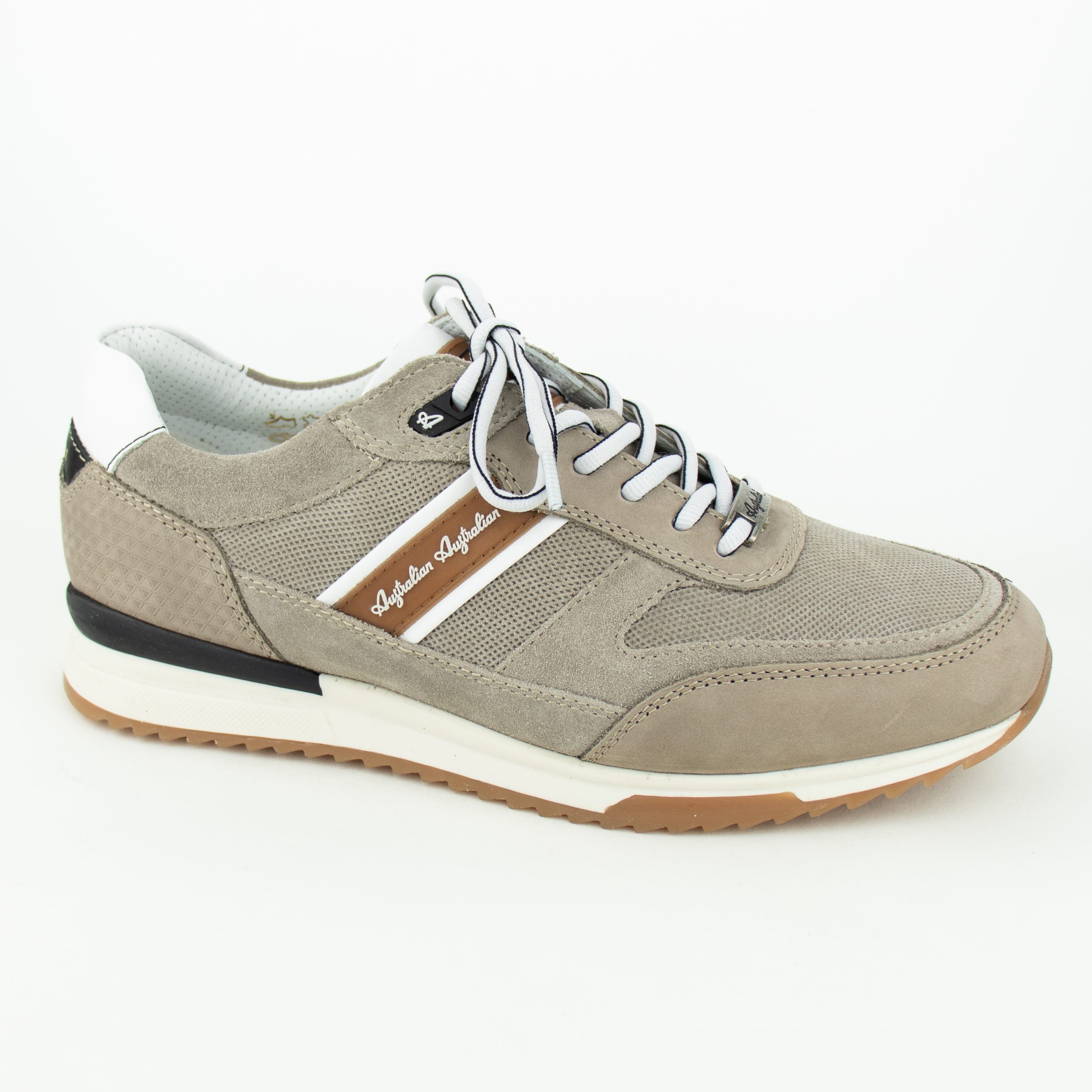 Deze sneaker weerspiegelt de basisprincipes waar Australian Footwear bekend om staat, namelijk kwaliteit en comfort. Sneaker Filmon is uitgevoerd in taupe nubuck/cognac/wit combinatie. Het logo is duidelijk zichtbaar aan de zijkant en op de hiel. Uitneembaar leder voetbed, geschikt voor eigen zooltjes. Vetersluiting.