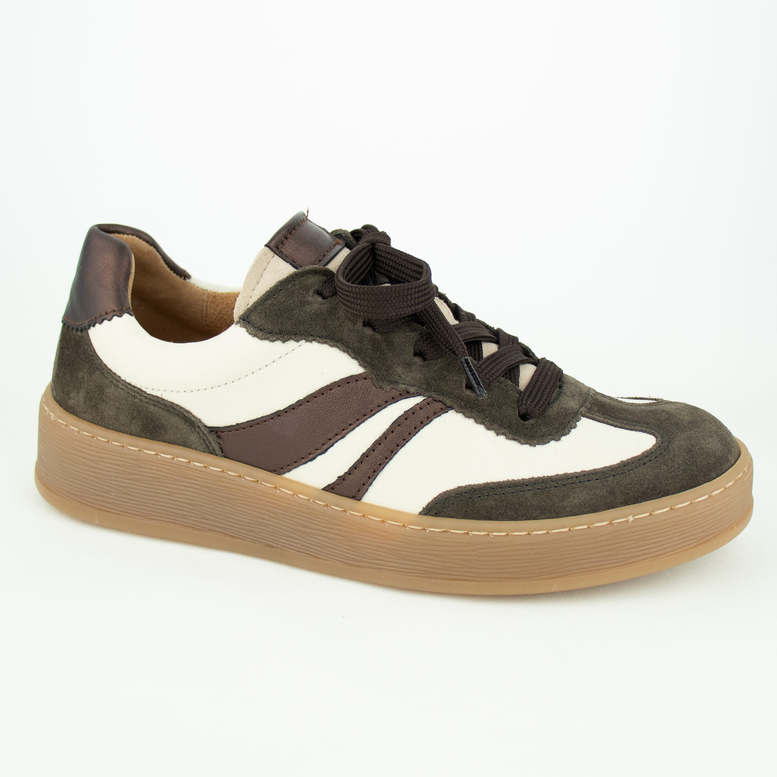 Sneaker uit de comfort collectie van Gabor, uitgevoerd in bruin suède/beige leder combinatie. Vetersluiting. Uitneembaar voetbed/geschikt voor eigen zooltjes. Wijdtemaat G.