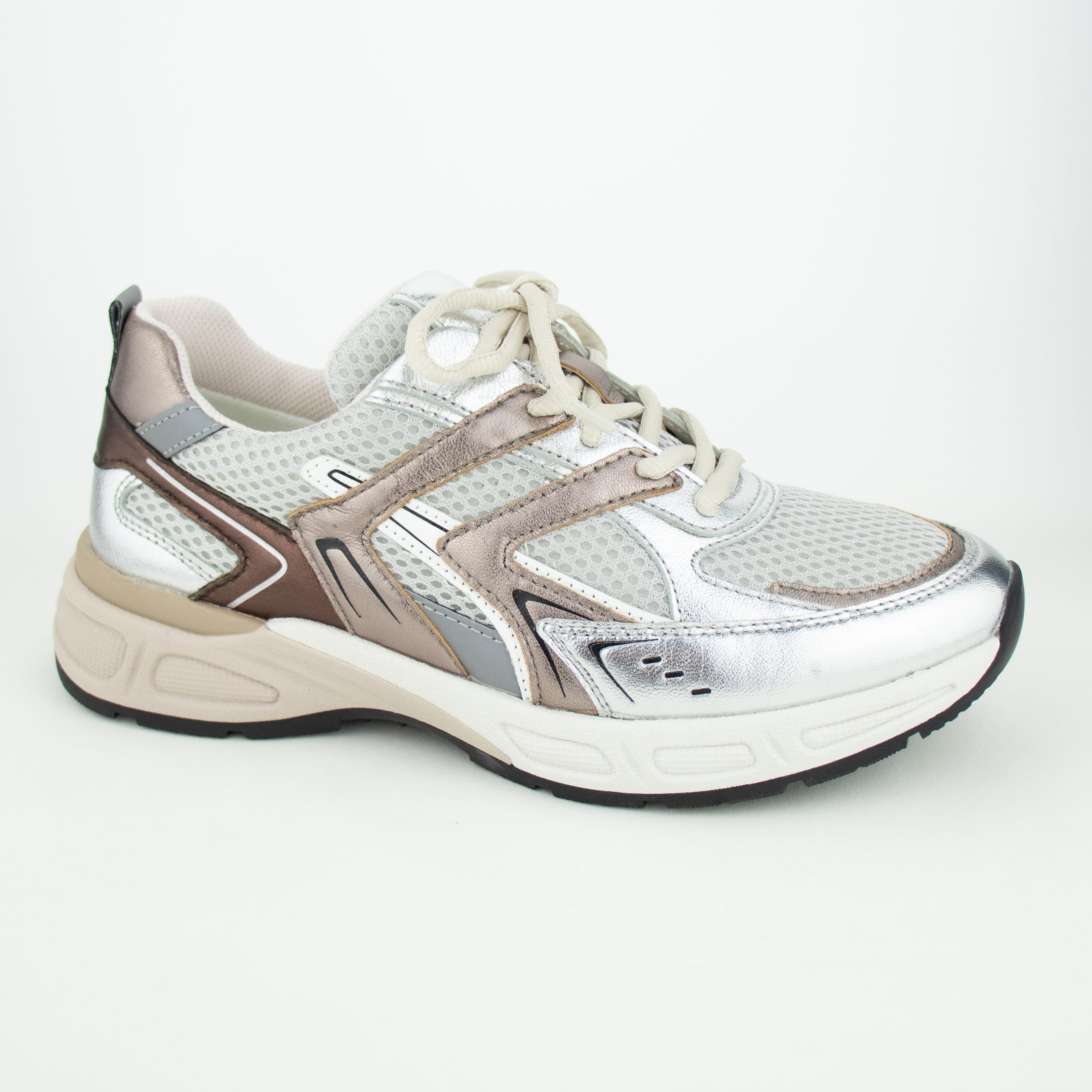 Sportieve sneaker uitgevoerd in de kleuren zilver, brons en wit in een combinatie van leer/canvas en mesh. Wijdtemaat H. Vetersluiting. Uitneembaar voetbed/geschikt voor eigen zooltjes. De binnenvoering is van microvezel.