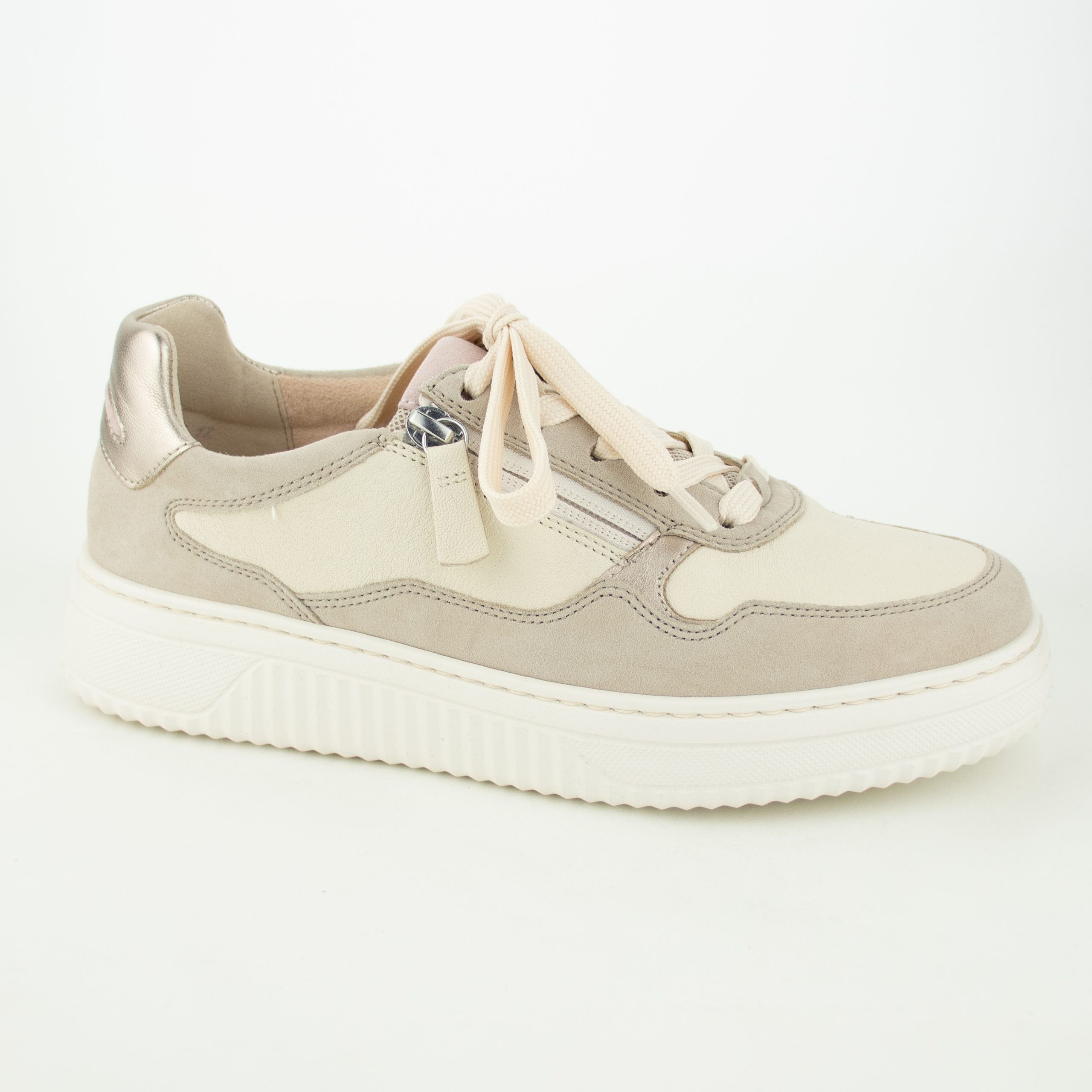 Sneaker uitgevoerd in taupe nubuck/beige leder met gouden accenten. Veter- en ritssluiting voor het gemakkelijk aan- en uittrekken. Uitneembaar leder voetbed, geschikt voor eigen zooltjes. Wijdtemaat K, voor de bredere voet.