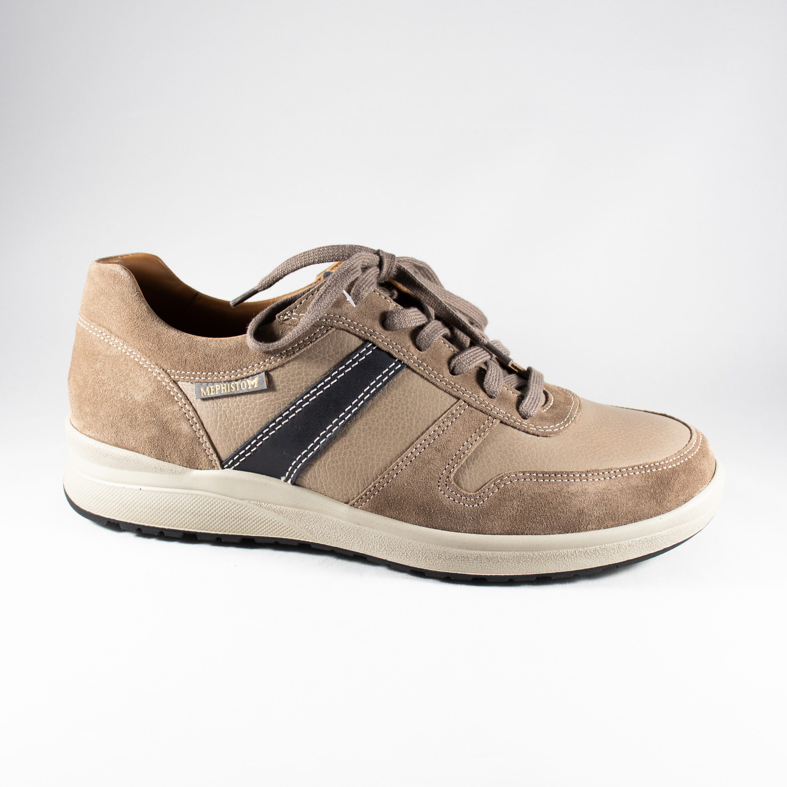 VITO van MEPHISTO: Deze aangenaam comfortabele schoen gaat overal met je mee. De sneaker is uitgevoerd in taupe suède/leder combinatie met een blauw accent aan de zijkanten en de tong. De Vito heeft soft air technologie, air relax en een shock absorber. Uitneembaar voetbed / geschikt voor eigen steunzolen. Vetersluiting.