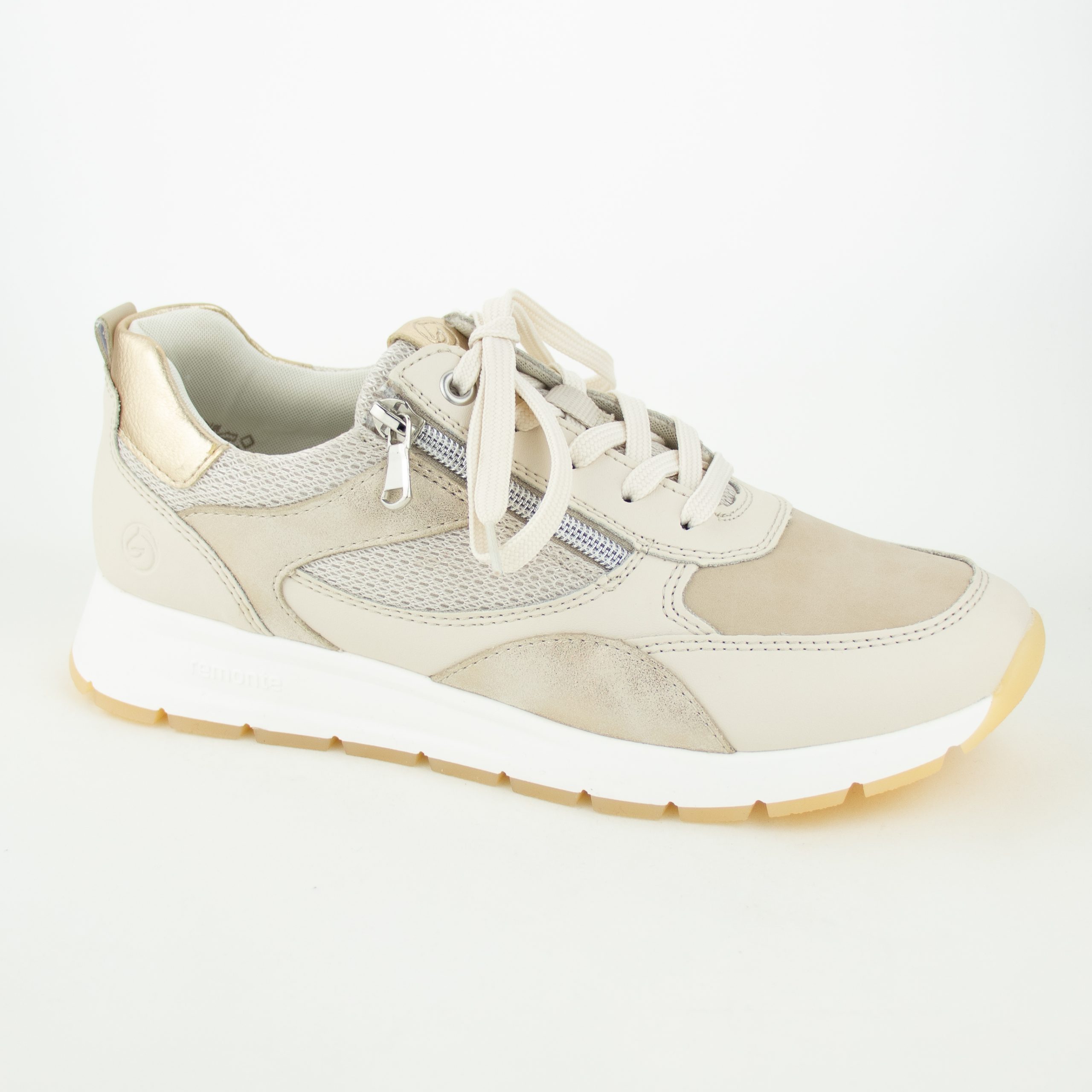 Sneaker uitgevoerd in beige leder/goud metallic combinatie.  Aangenaam loopcomfort dankzij schok-dempende materialen.