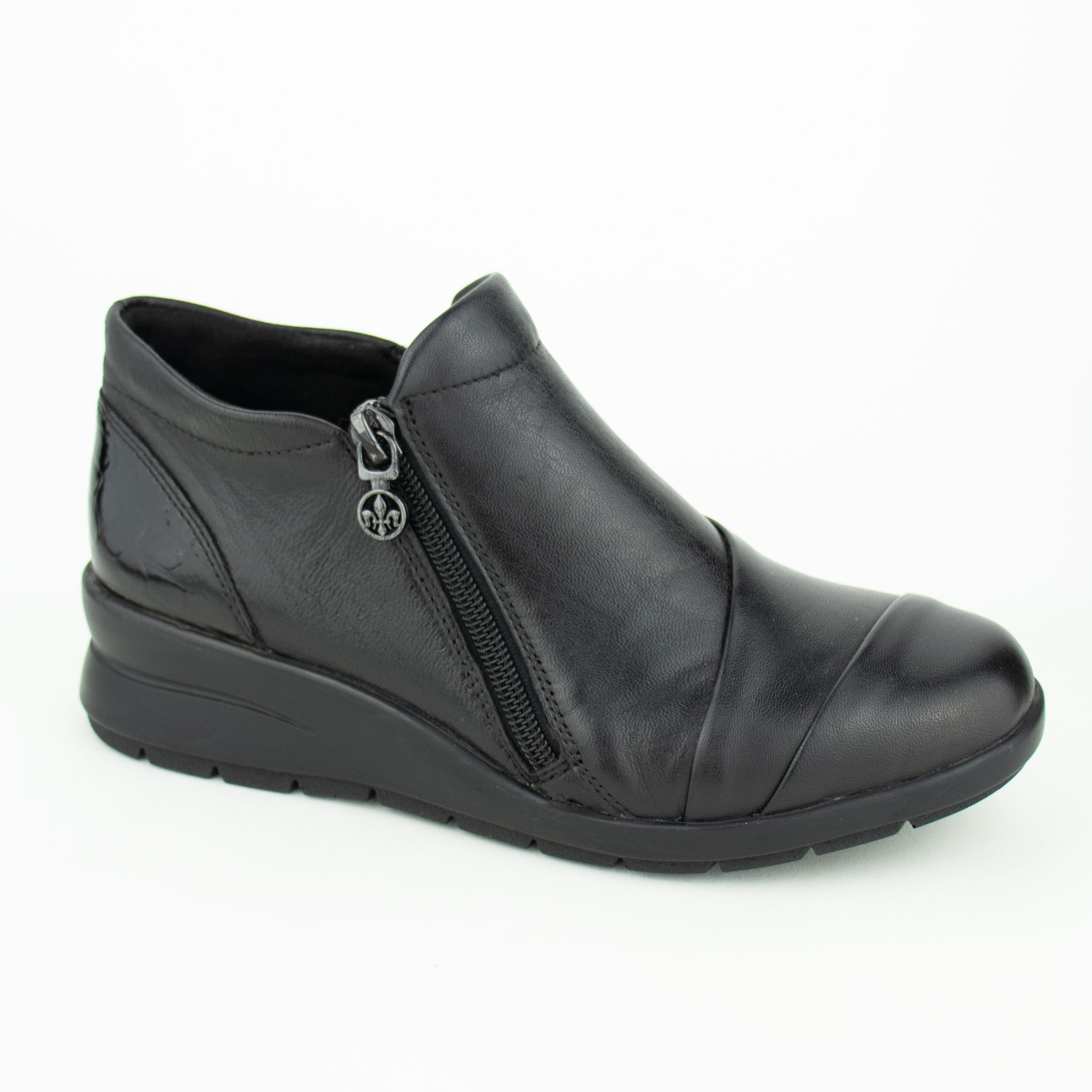 Deze enkelhoge schoen is uitgevoerd in zwart leder met een zwart kroko print aan de hiel en heeft een zwarte zool met lichte hakverhoging. Ritssluiting voor het gemakkelijk aan- en uittrekken.
