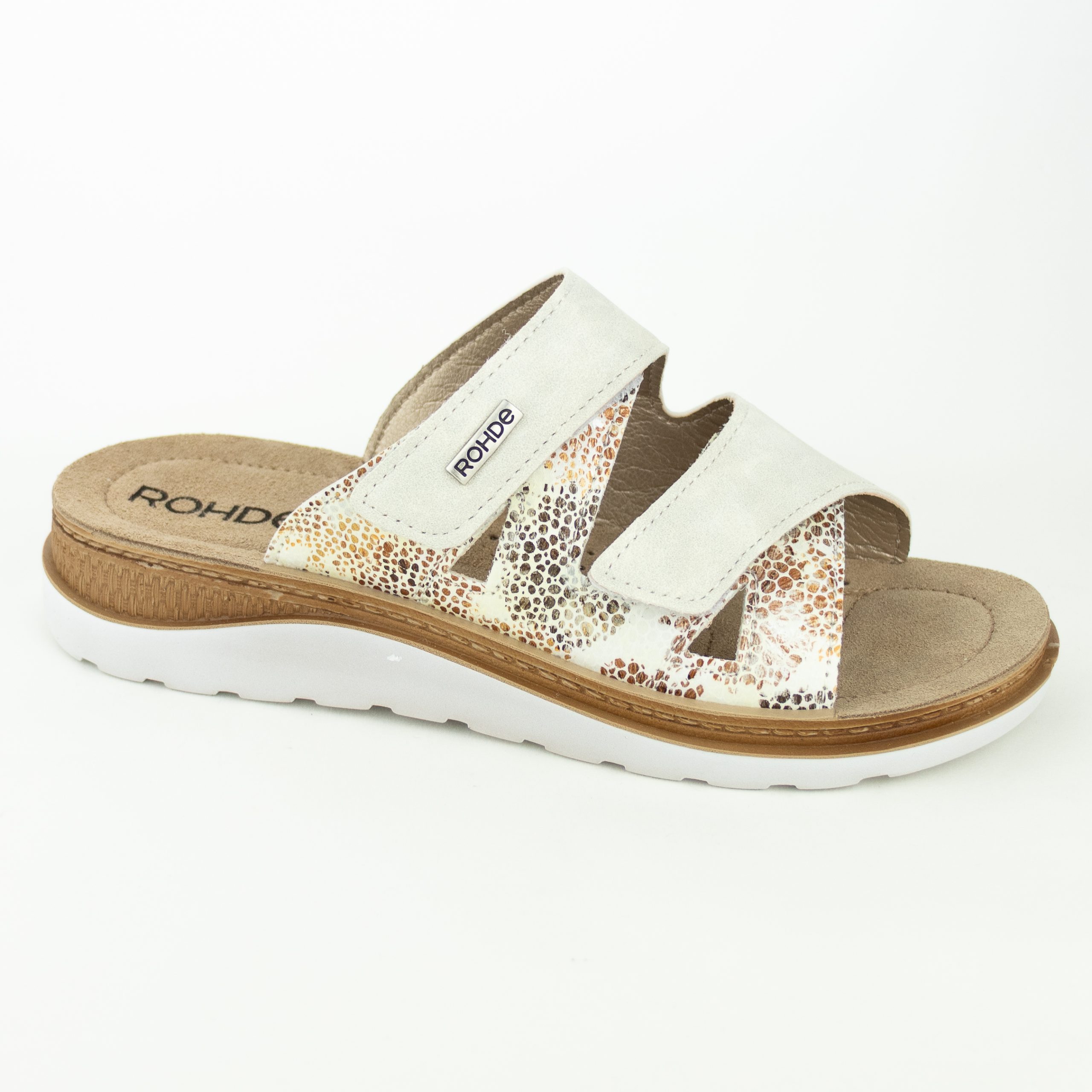 Deze Rohde slippers hebben een elegant design dat perfect past bij elke outfit. Het leren voetbed zorgt voor extra comfort en ondersteuning, waardoor je de hele dag moeiteloos kunt rondlopen. Het gebruik van leer maakt deze slippers duurzaam en van hoge kwaliteit. Of je nu naar het strand gaat of een stadswandeling maakt, deze Rohde dames slippers bieden het beste van beide werelden: stijl en comfort. Met deze Rohde dames slippers uitgevoerd in parlemoer metallic/print combinatie ben je klaar voor de zomer. Door de 2 klittenbandsluitingen past de slipper perfect om elke voet.