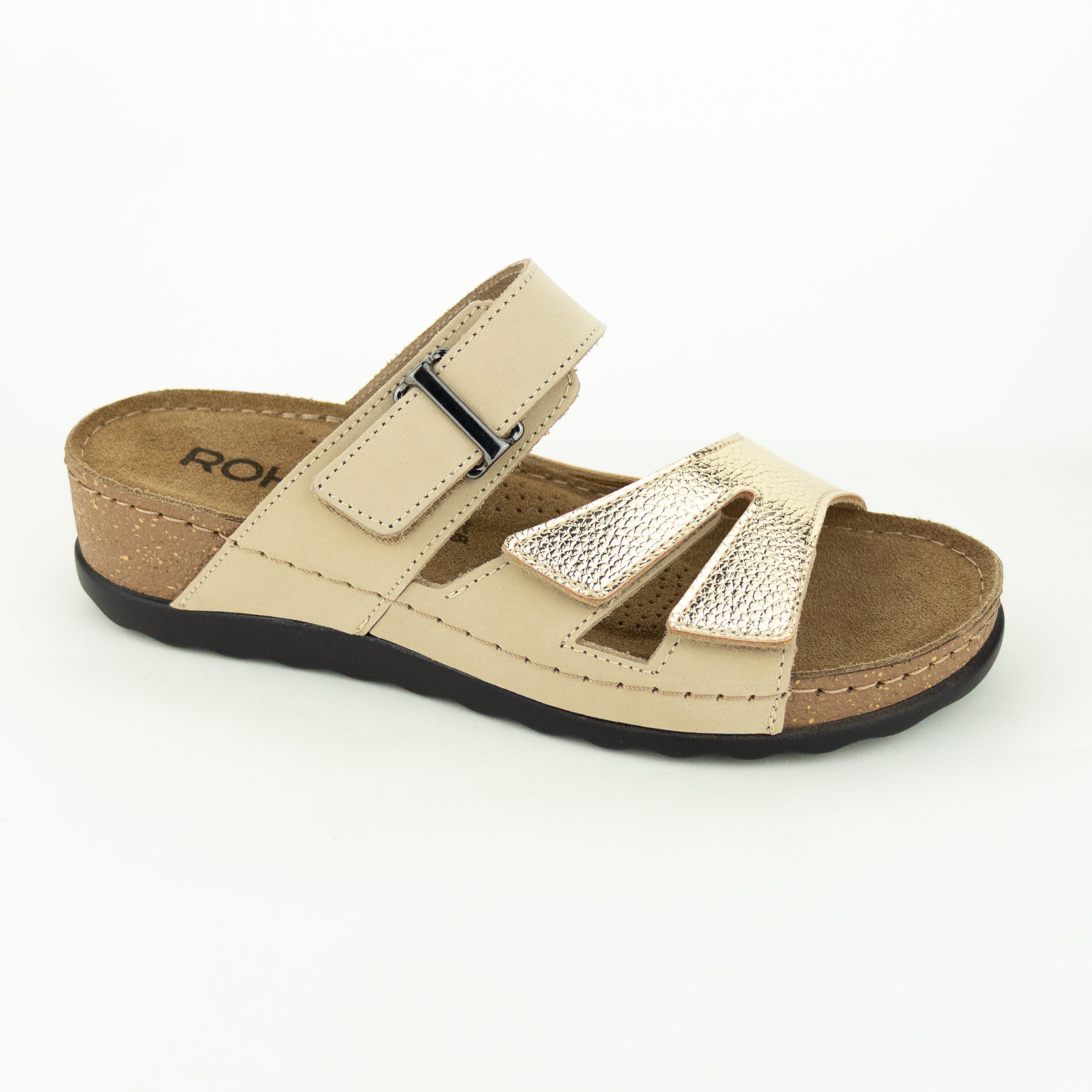 Slipper uitgevoerd in goud metallic/beige nubuck combinatie. Optimaal verstelbaar d.m.v. de 2 klittenbanden.  Leder voering en leder zacht voetbed.