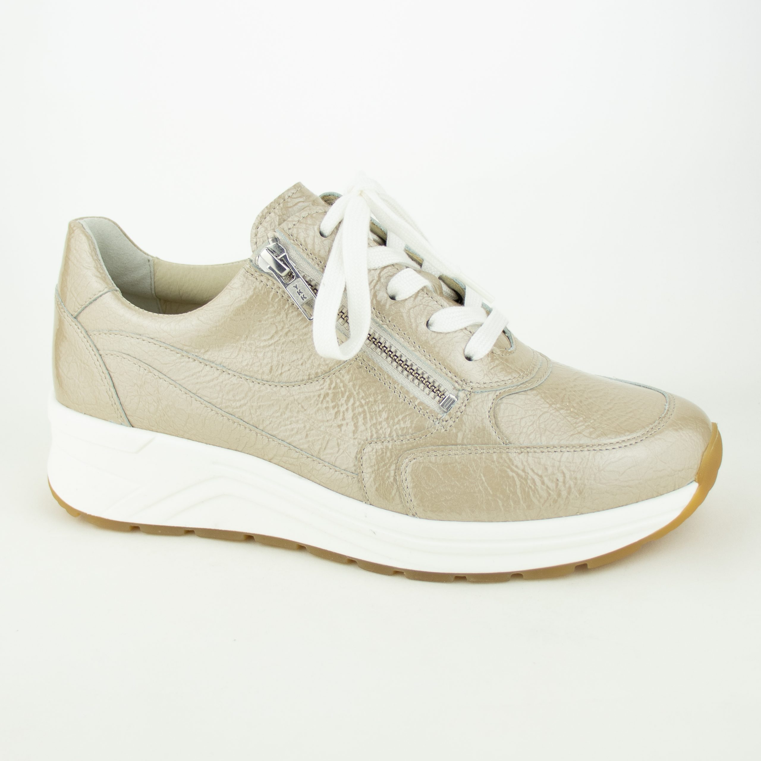 Sneaker Holly is uitgevoerd in beige kreuklak-leder. Het natuurcomfort voetbed is anatomisch gevormd en ademend. Zachte voorvoetbedding voor de gevoelige middenvoetsbeentjes. Uitneembaar voetbed/geschikt voor eigen zooltjes. Veter- en ritssluiting voor het gemakkelijk aan- en uittrekken. Wijdte-maat H.