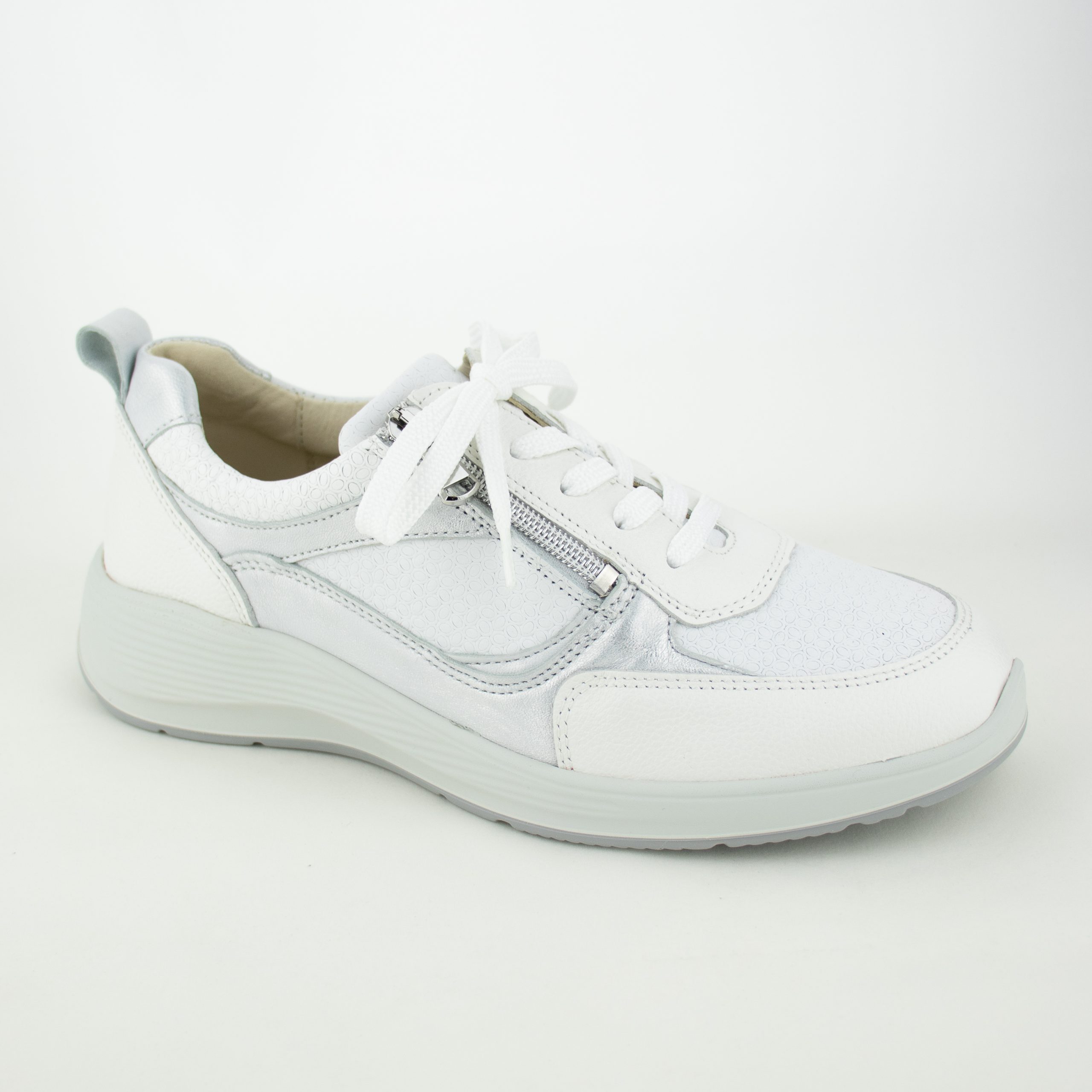 Sneaker Kalea is uitgevoerd in wit leder/zilver metallic combinatie en heeft een veter- en dubbele ritssluiting voor het gemakkelijk aan en uittrekken. Wijdte maat K, voor de bredere voet.