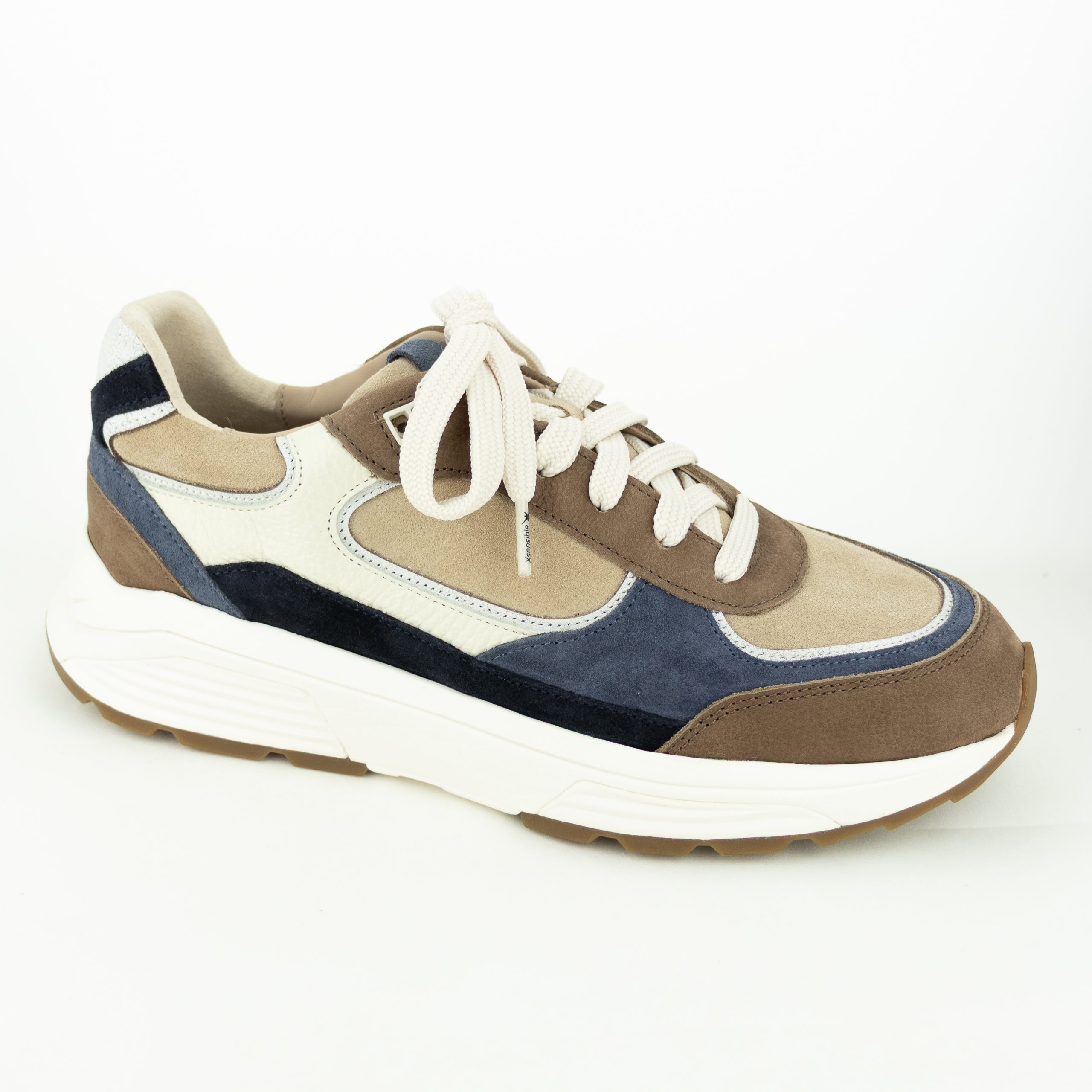 Sneaker Manhattan is uitgevoerd in bruin/blauw/beige suède/leder combinatie. Vetersluiting. Wijdtemaat H.