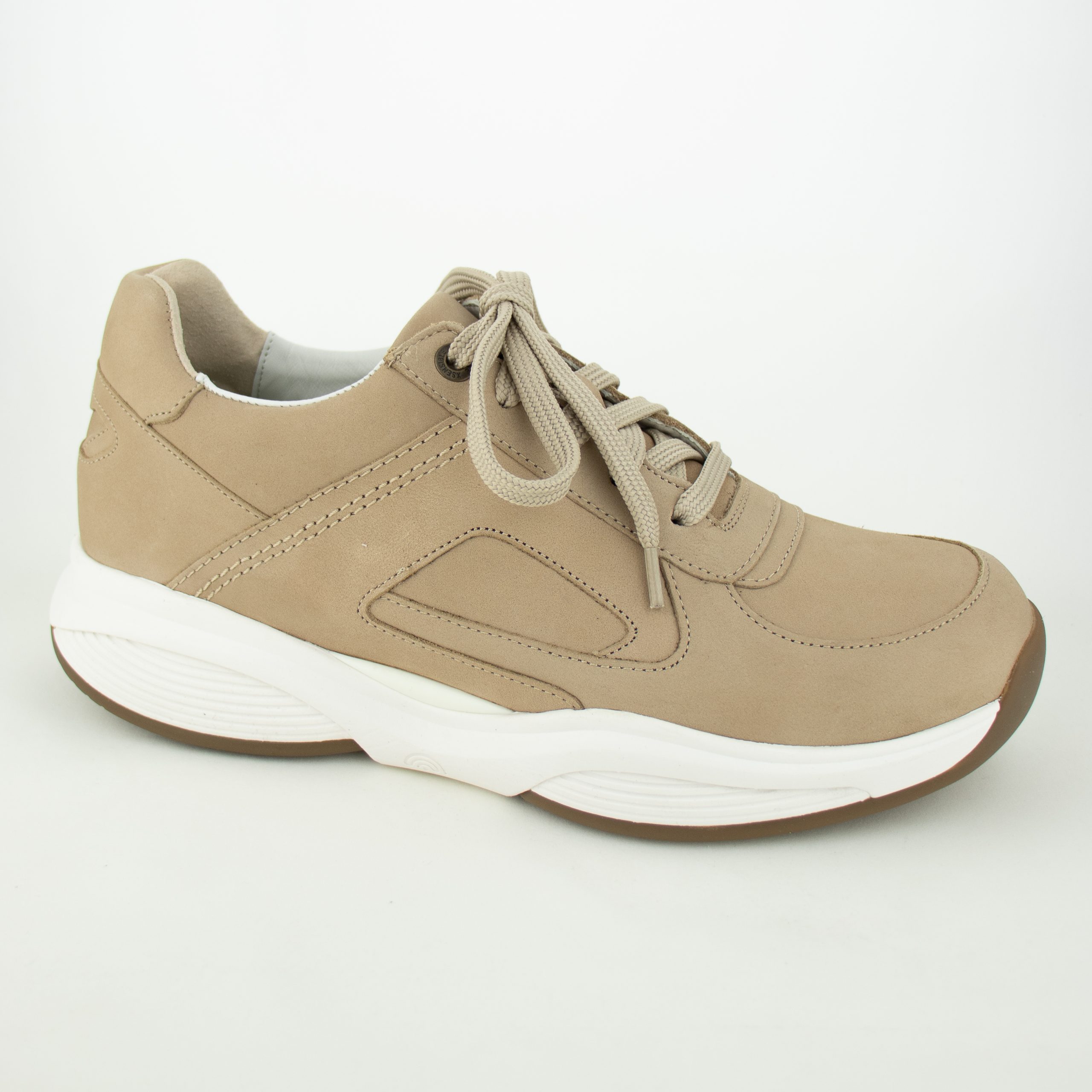 Sneaker uitgevoerd in uni taupe nubuck-leder. Veter- en ritssluiting voor het gemakkelijk aan- en uittrekken.