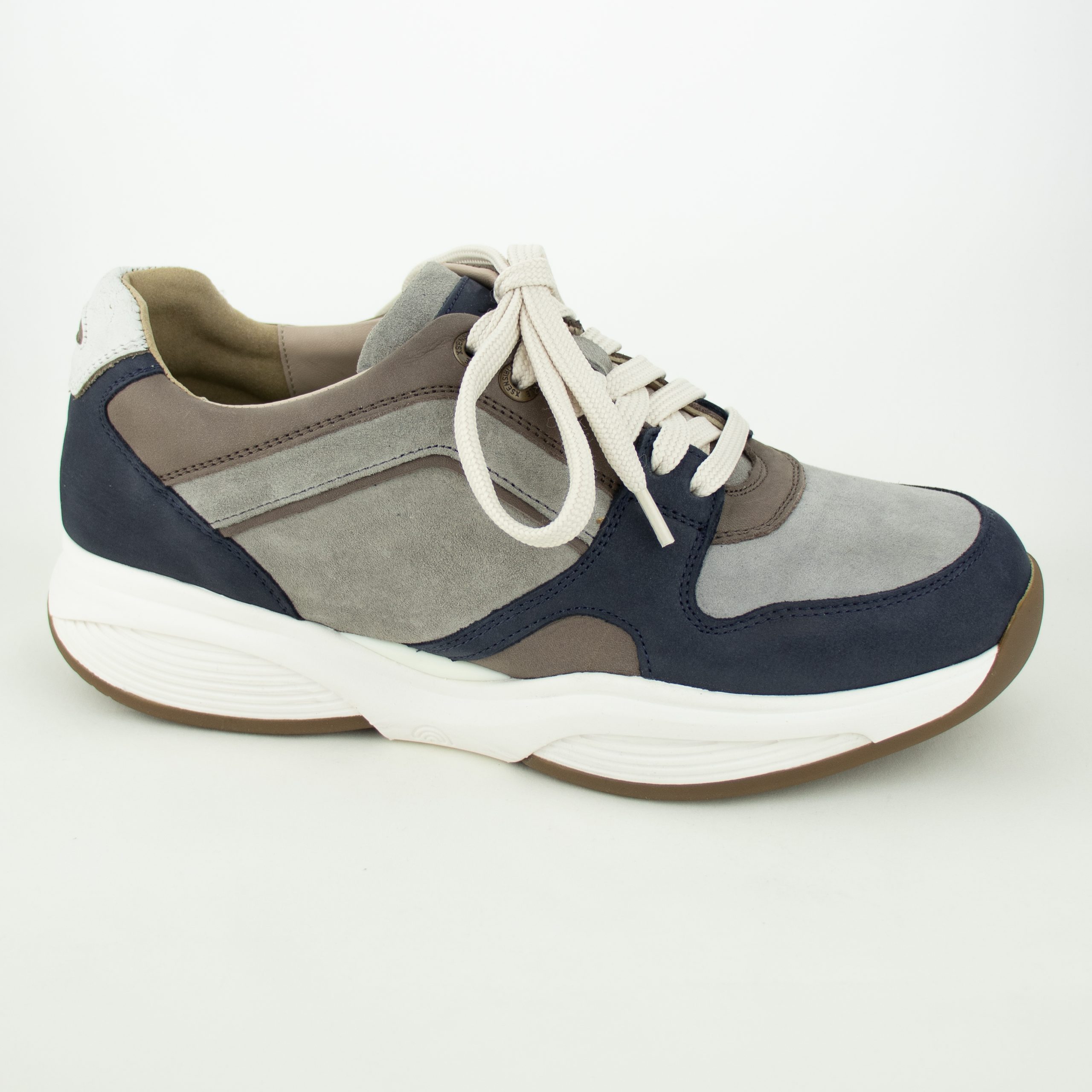Sneaker uitgevoerd in blauw nubuck/grijs suède met bruine accenten. Veter- en ritssluiting voor het gemakkelijk aan- en uittrekken.